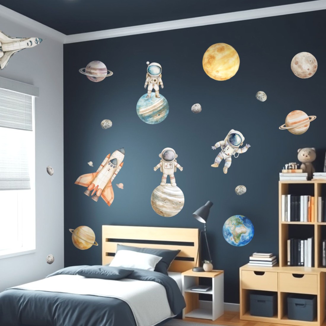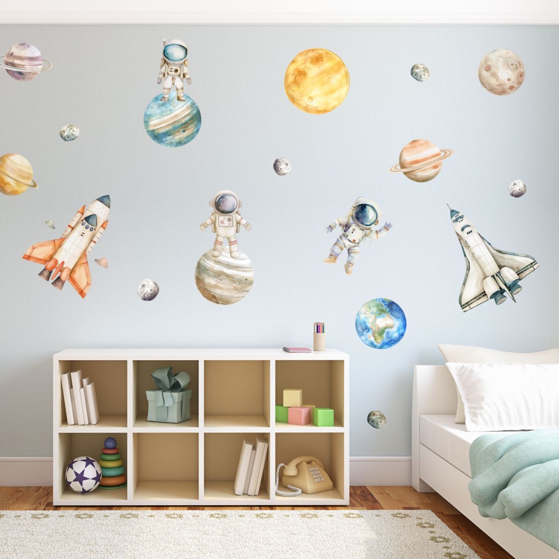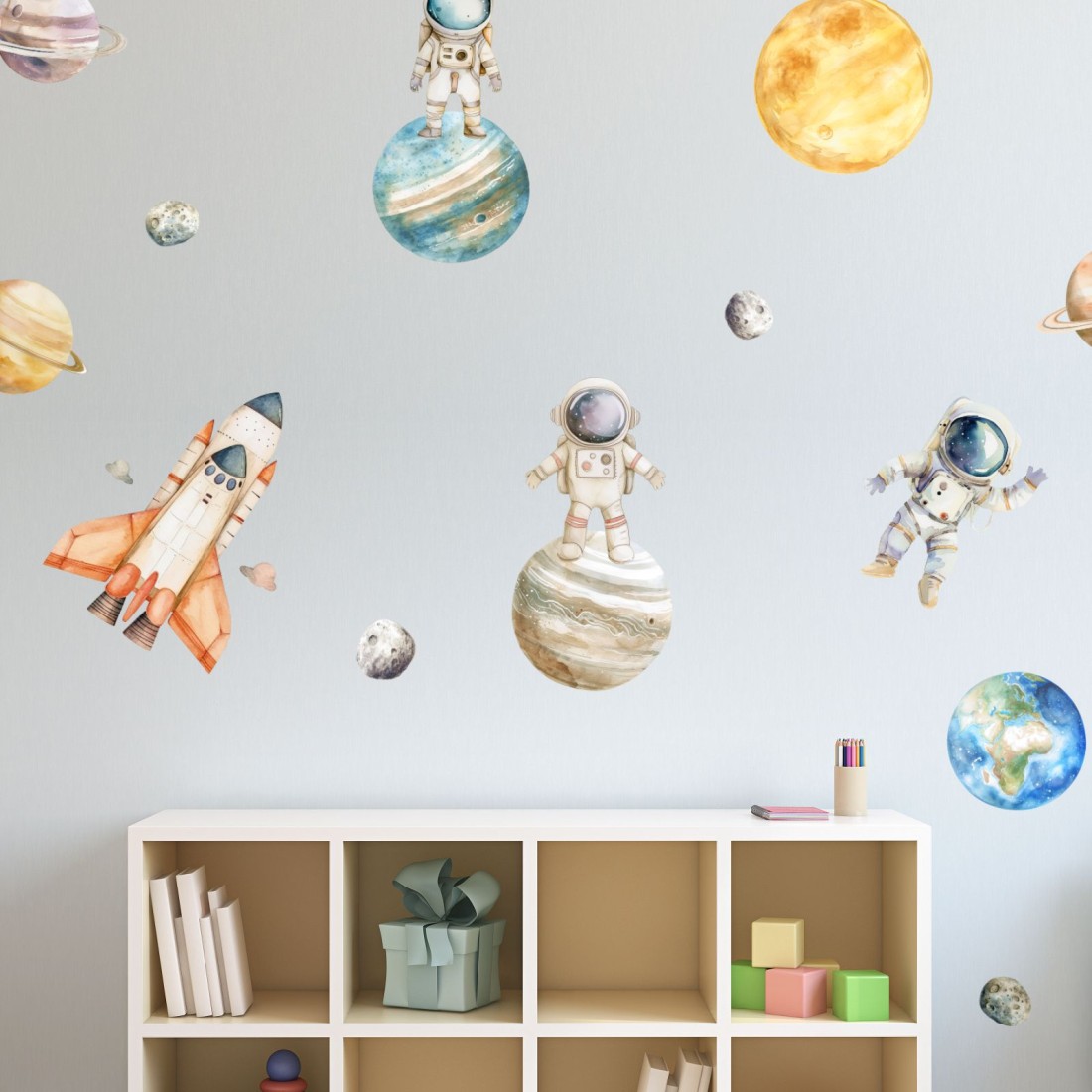Παιδικα αυτοκόλλητα τοίχου με μικρούς αστροναύτες και πλανήτες , ιδανικό για παιδικό και εφηβικό δωμάτιο αλλά και σε σχολεία, παιδικούς σταθμούς & λοιπούς εκπαιδευτικούς χώρους.