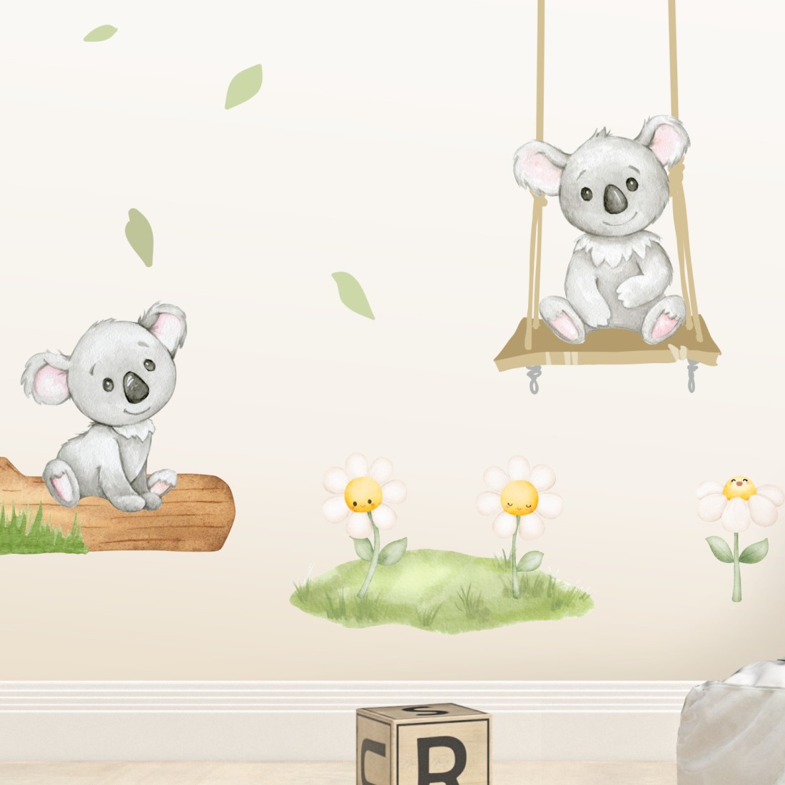 Watercolor αυτοκόλλητα τοίχου με χαριτωμένα αρκουδάκια Κοάλα πάνω σε κλαδί, ιδανικό για παιδικό δωμάτιο.