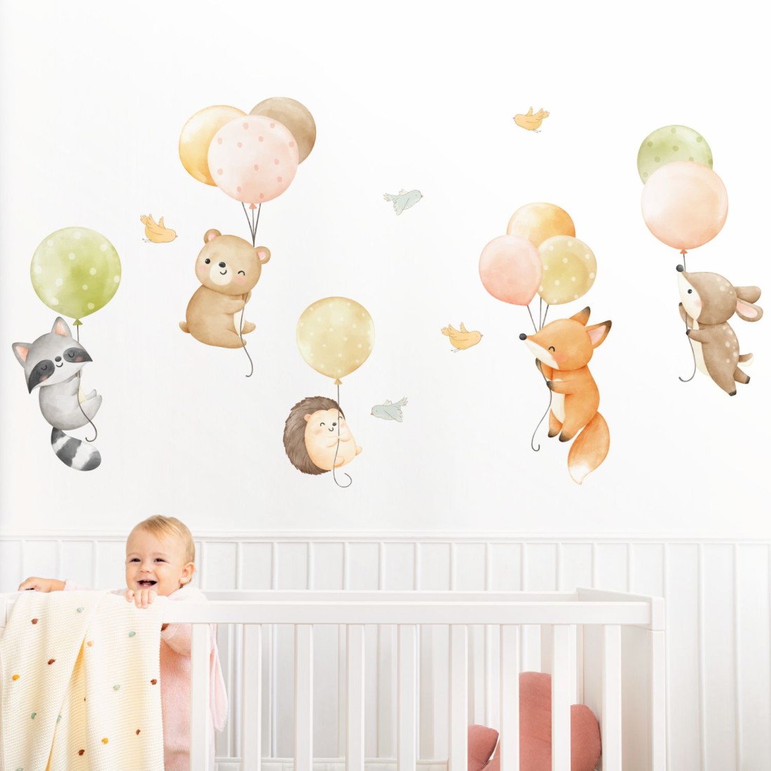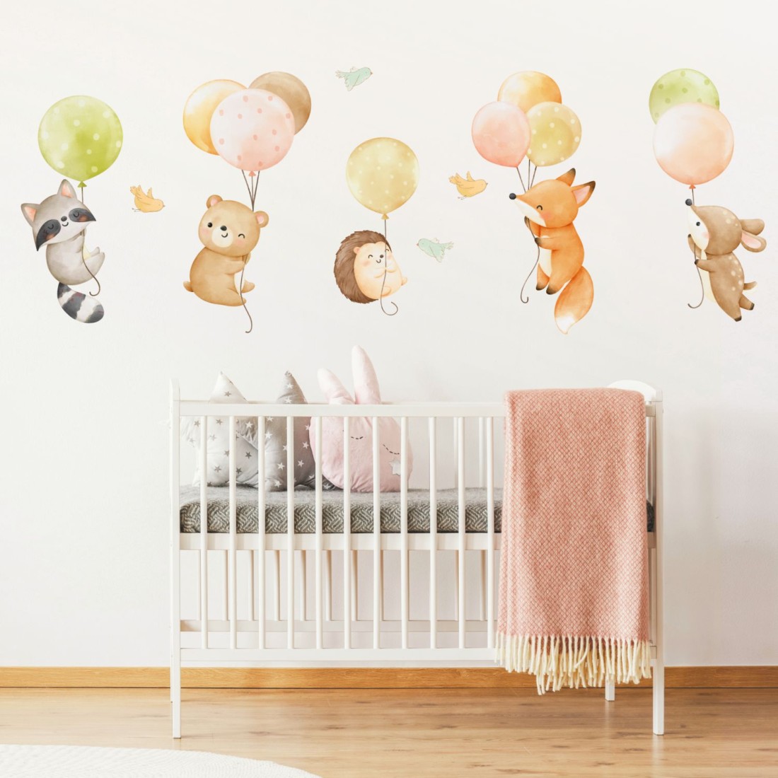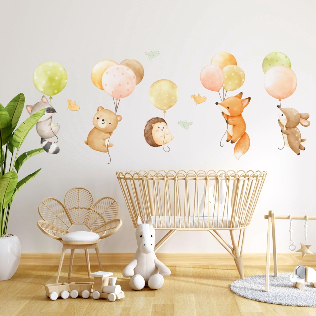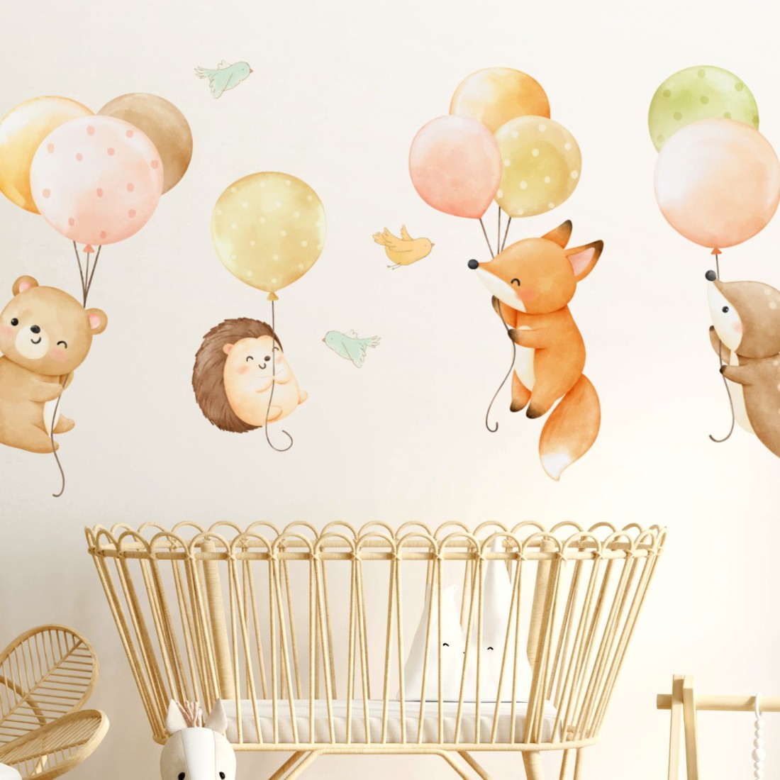 Αυτοκόλλητα τοίχου παιδικά με χαριτωμένα ζωάκια με μπαλόνια σε ζεστά, ουδέτερα χρώματα, ιδανικά για βρεφικό και παιδικό δωμάτιο.