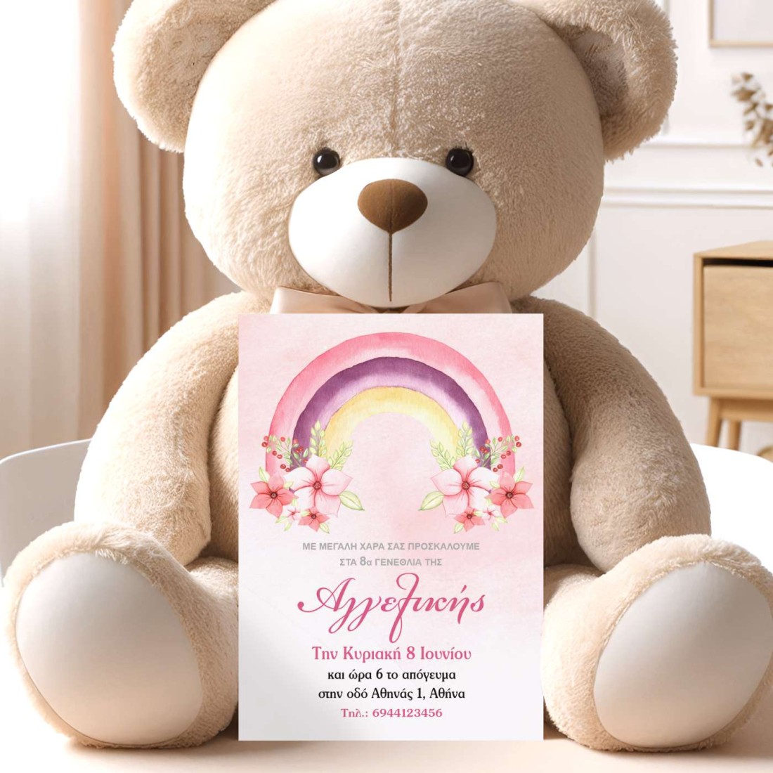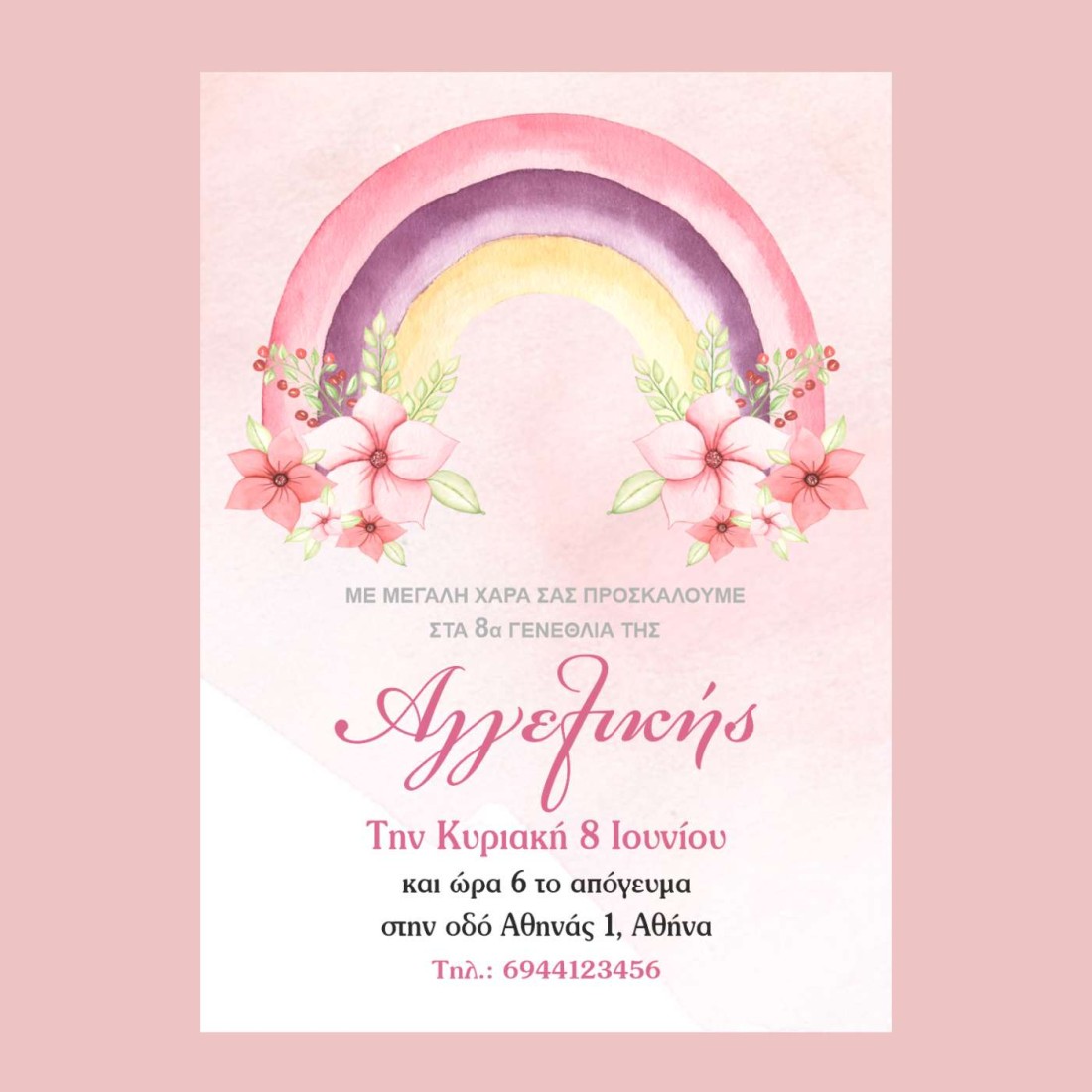 Προσωποποιημένη πρόσκληση σε παιδικό πάρτι γενεθλίων σε παστέλ χρώματα με όνομα παιδιού.