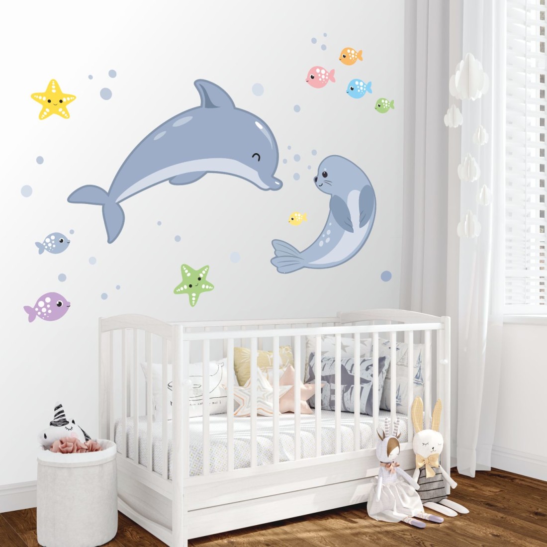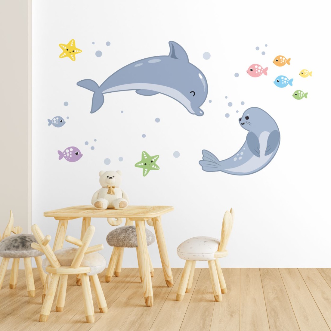 Σετ αυτοκόλλητα τοίχου παιδικά με παιχνιδιάρικο δελφίνι, χαριτωμένη φώκια και ψαράκια. Ιδανικά για βρεφικό και παιδικό δωμάτιο, καθώς και για παιδικούς σταθμούς, νηπιαγωγεία και εκπαιδευτικούς χώρους.